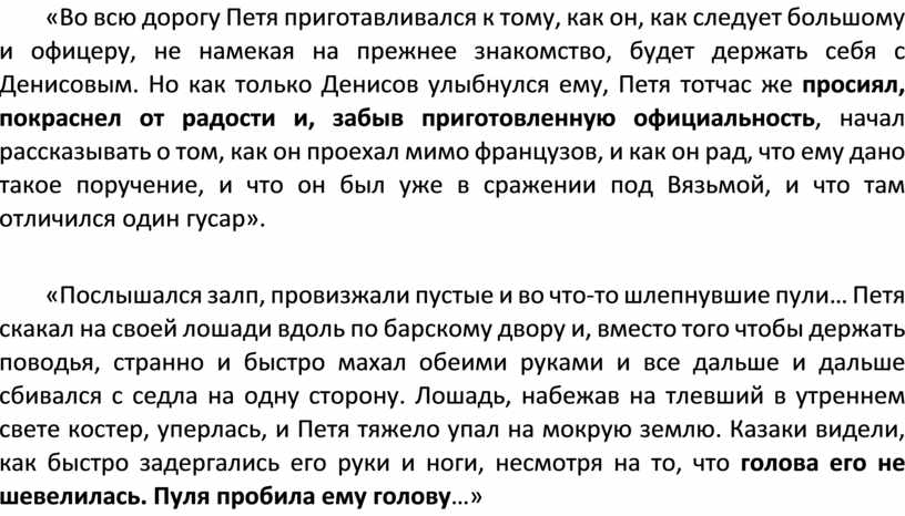 «Послышался залп, провизжали пустые и во что-то шлепнувшие пули… Петя скакал на своей лошади вдоль по барскому двору и, вместо того чтобы держать поводья, странно и быстро махал обеими руками и все дальше и дальше сбивался с седла на одну сторону. Лошадь, набежав на тлевший в утреннем свете костер, уперлась, и Петя тяжело упал на мокрую землю. Казаки видели, как быстро задергались его руки и ноги, несмотря на то, что голова его не шевелилась. Пуля пробила ему голову…»
