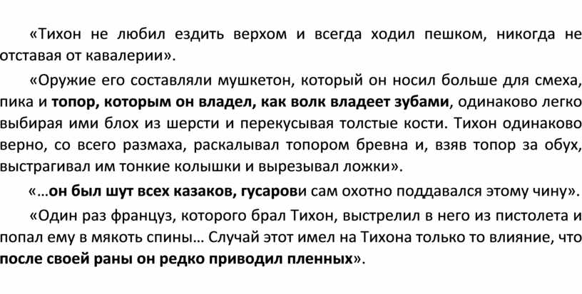 «Тихон не любил ездить верхом и всегда ходил пешком, никогда не отставая от кавалерии».