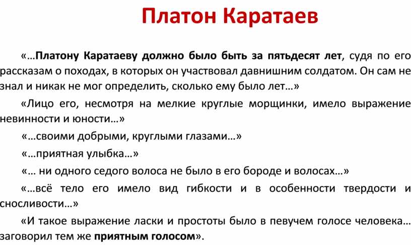 «…Платону Каратаеву должно было быть за пятьдесят лет, судя по его рассказам о походах, в которых он участвовал давнишним солдатом. Он сам не знал и никак не мог определить, сколько ему было лет…»