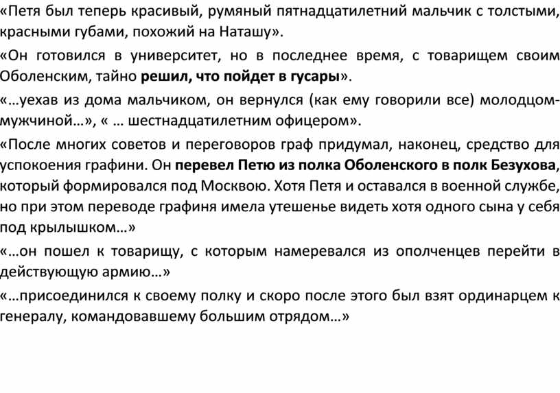 «Петя был теперь красивый, румяный пятнадцатилетний мальчик с толстыми, красными губами, похожий на Наташу».