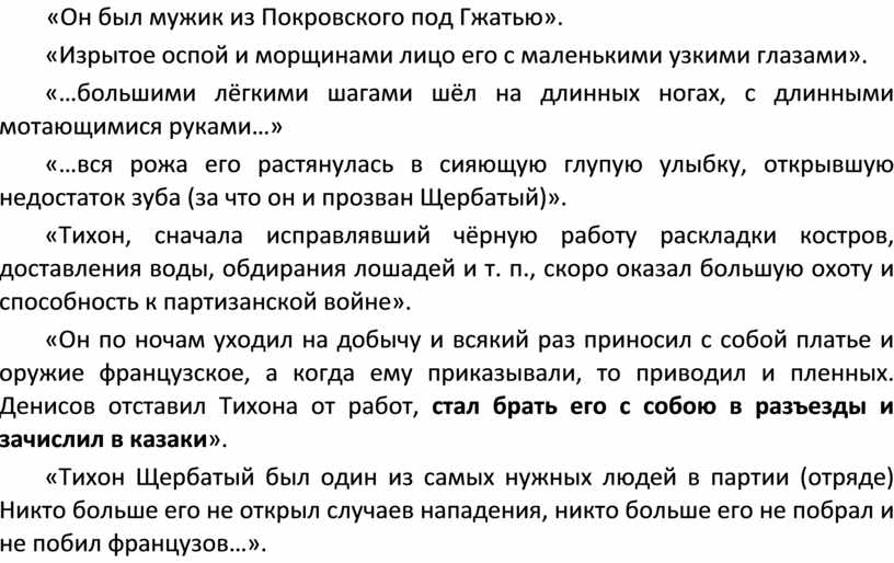 «Он по ночам уходил на добычу и всякий раз приносил с собой платье и оружие французское, а когда ему приказывали, то приводил и пленных. Денисов отставил Тихона от работ, стал брать его с собою в разъезды и зачислил в казаки».