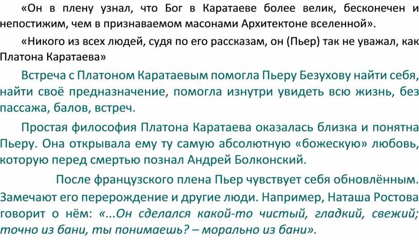 «Он в плену узнал, что Бог в Каратаеве более велик, бесконечен и непостижим, чем в признаваемом масонами Архитектоне вселенной».