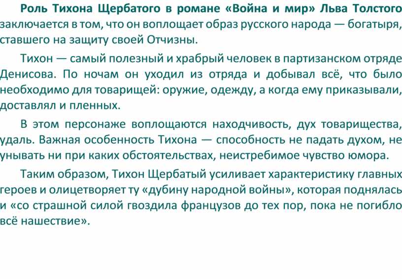 Таким образом, Тихон Щербатый усиливает характеристику главных героев и олицетворяет ту «дубину народной войны», которая поднялась и «со страшной силой гвоздила французов до тех пор, пока не погибло всё нашествие».