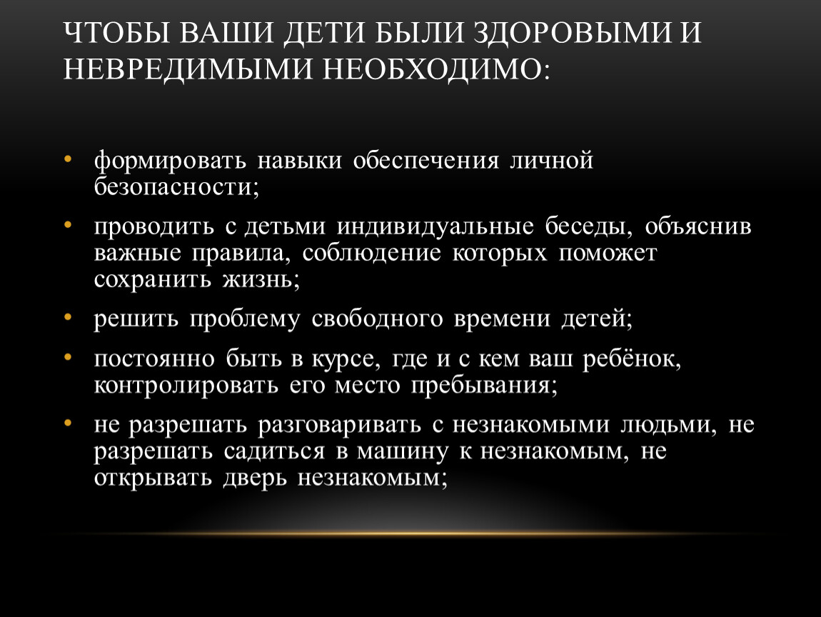 не разрешать разговаривать с незнакомыми людьми, не разрешать садиться в машину к незнакомым, не открывать дверь незнакомым;