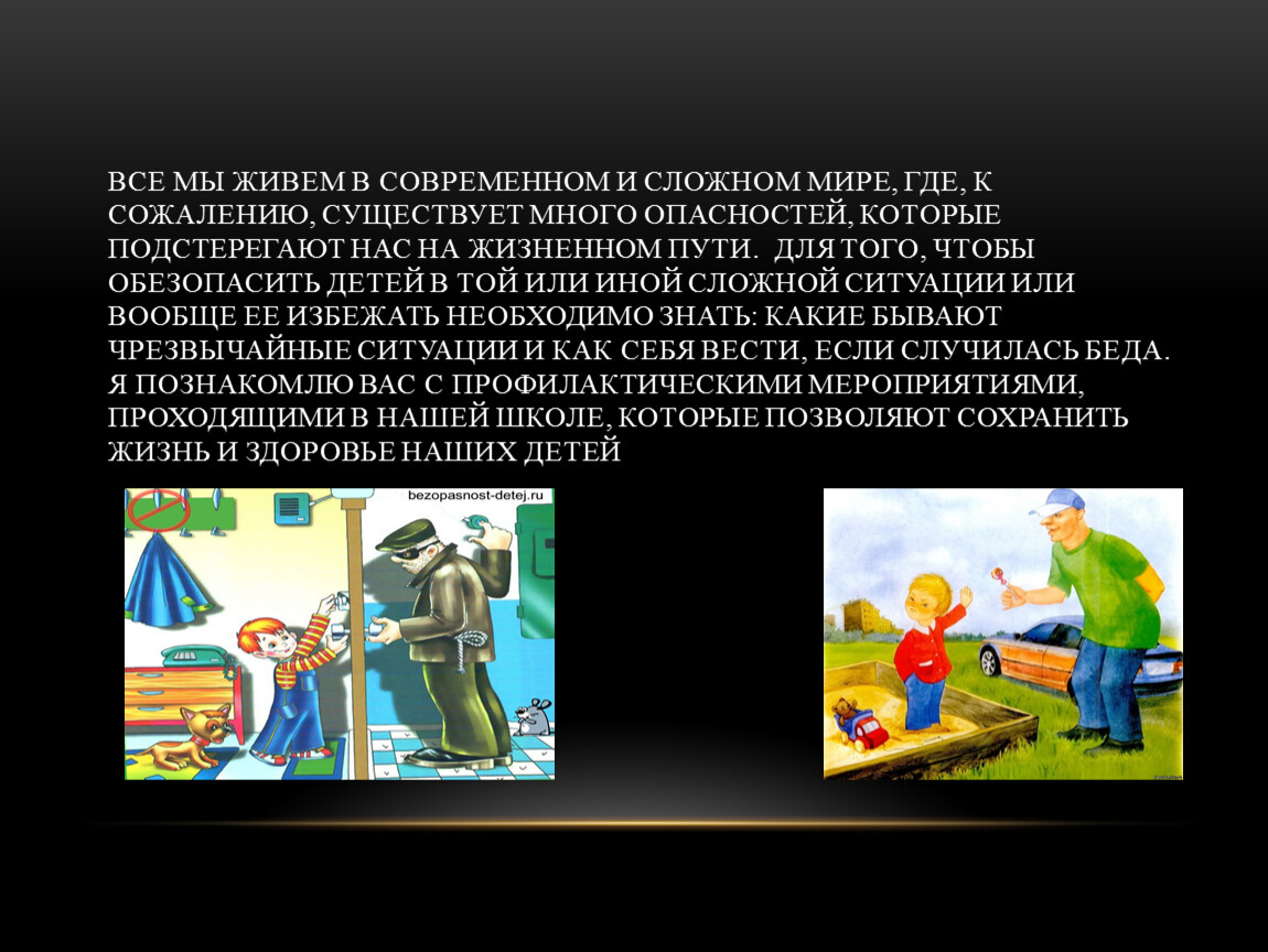 Все мы живем в современном и сложном мире, где, к сожалению, существует много опасностей, которые подстерегают нас на жизненном пути. Для того, чтобы обезопасить детей в той или иной сложной ситуации или вообще ее избежать необходимо знать: какие бывают чрезвычайные ситуации и как себя вести, если случилась беда. Я познакомлю вас с профилактическими мероприятиями, проходящими в нашей школе, которые позволяют сохранить жизнь и здоровье наших детей