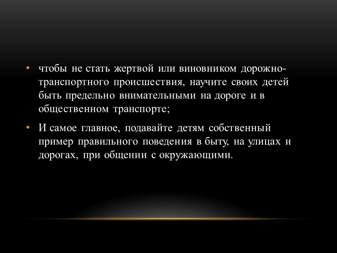 чтобы не стать жертвой или виновником дорожно-транспортного происшествия, научите своих детей быть предельно внимательными на дороге и в общественном транспорте;