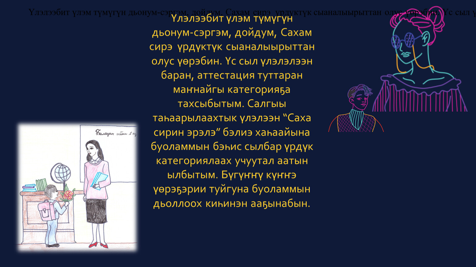Инники идэбин таларбар улахан ыарахаттары көрсүбэтэҕим, номнуо орто сүһүөх кылааска үөрэнэ сылдьан баҕабын быһаарбытым: сүрэҕим учуутала буолуон баҕарарын эппитэ. Баҕабын толороорубун, сыалбын ситиһээрибин, биир кэлим экзээмэммэр умсугуйан туран бэлэмнэнэн үрдүк таһымнаахтык туттардым