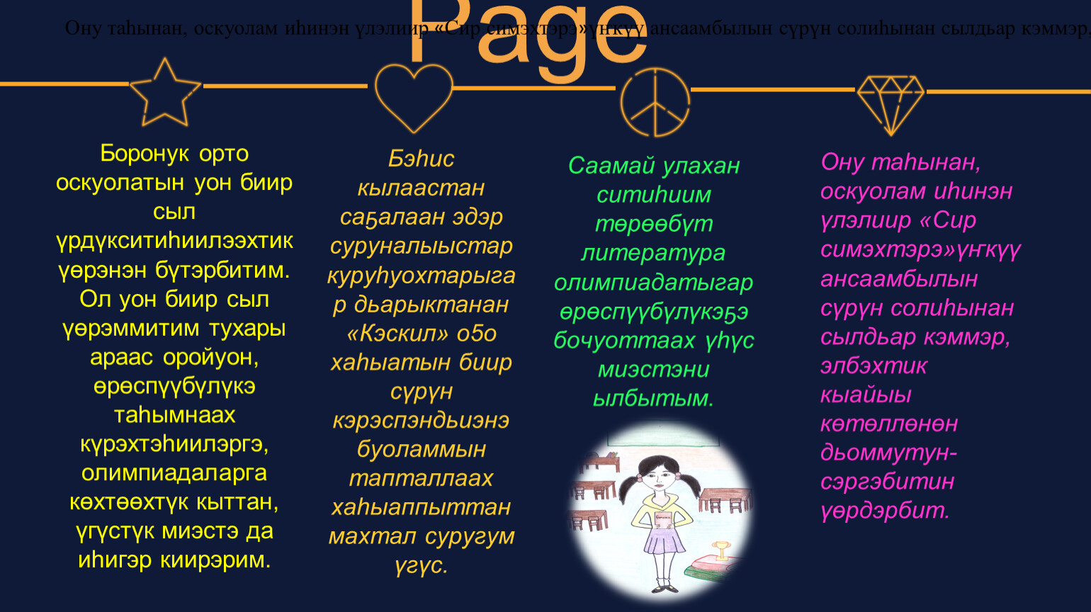 Ону таһынан, оскуолам иһинэн үлэлиир «Сир симэхтэрэ»үҥкүү ансаамбылын сүрүн солиһынан сылдьар кэммэр, элбэхтик кыайыы көтөллөнөн дьоммутун-сэргэбитин үөрдэрбит.
