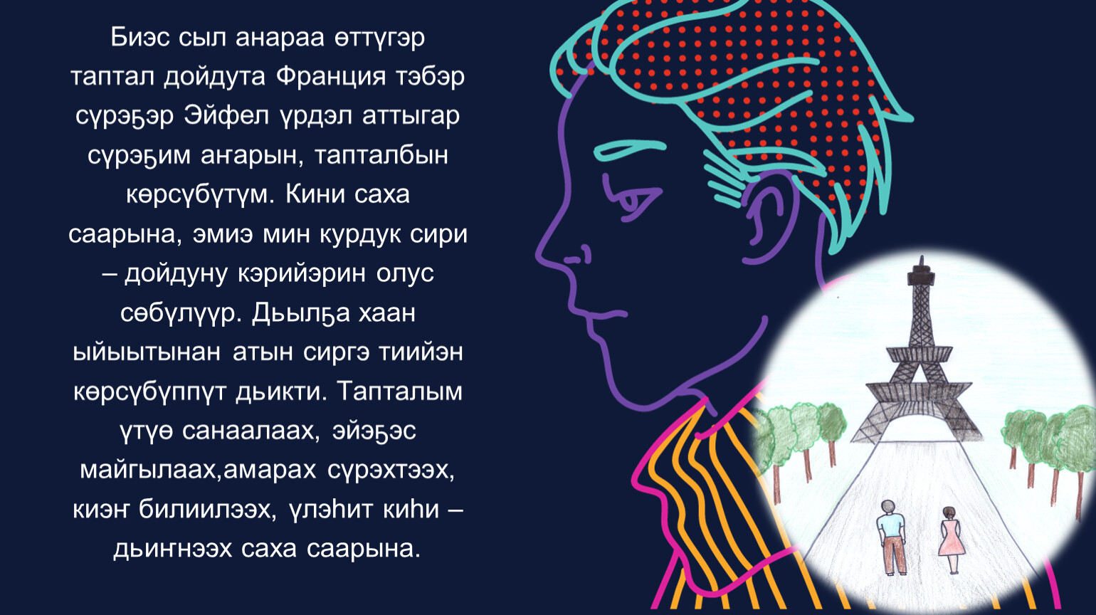 Биэс сыл анараа өттүгэр таптал дойдута Франция тэбэр сүрэҕэр Эйфел үрдэл аттыгар сүрэҕим аҥарын, тапталбын көрсүбүтүм. Кини саха саарына, эмиэ мин курдук сири – дойдуну кэрийэрин олус сөбүлүүр. Дьылҕа хаан ыйыытынан атын сиргэ тиийэн көрсүбүппүт дьикти. Тапталым үтүө санаалаах, эйэҕэс майгылаах,амарах сүрэхтээх, киэҥ билиилээх, үлэһит киһи – дьиҥнээх саха саарына.