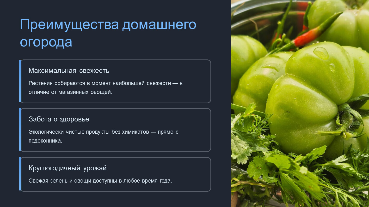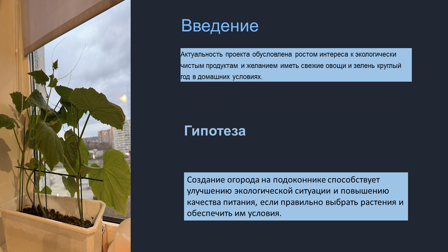 Актуальность проекта обусловлена ростом интереса к экологически чистым продуктам и желанием иметь свежие овощи и зелень круглый год в домашних условиях.