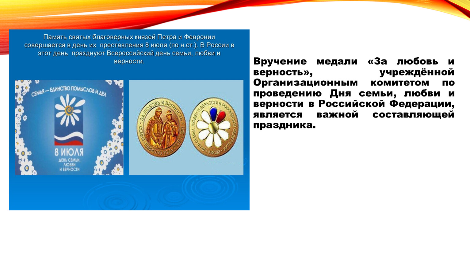 Вручение медали «За любовь и верность», учреждённой Организационным комитетом по проведению Дня семьи, любви и верности в Российской Федерации, является важной составляющей праздника.
