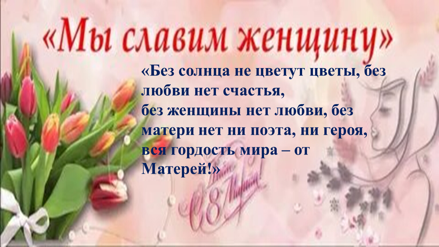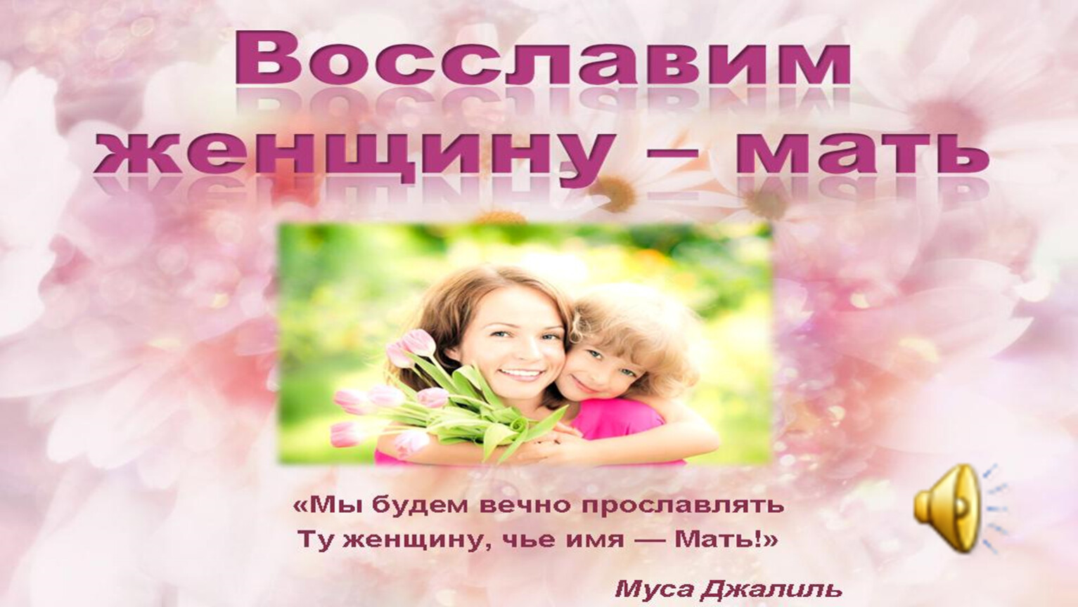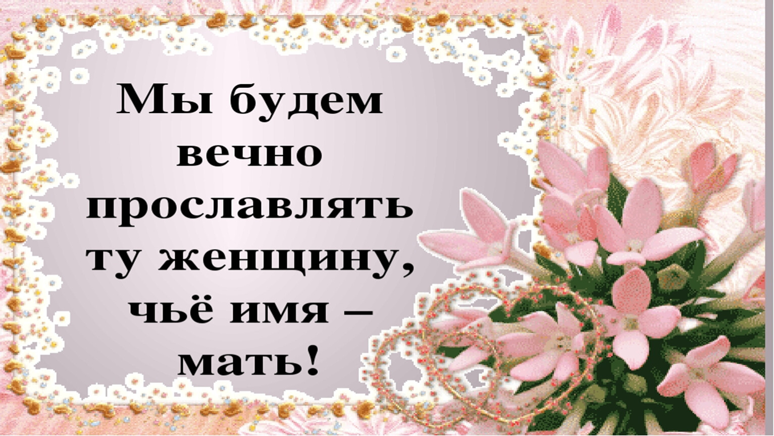 «Без солнца не цветут цветы, без любви нет счастья, без женщины нет любви, без матери нет ни поэта, ни героя, вся гордость мира – от Матерей!»