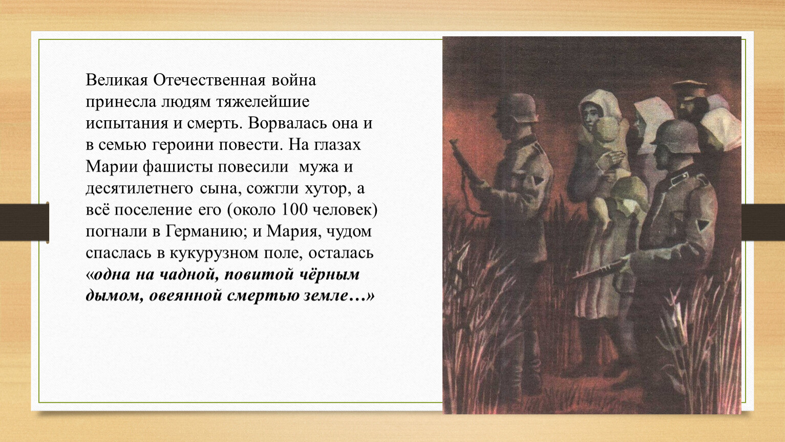 Великая Отечественная война принесла людям тяжелейшие испытания и смерть. Ворвалась она и в семью героини повести. На глазах Марии фашисты повесили мужа и десятилетнего сына, сожгли хутор, а всё поселение его (около 100 человек) погнали в Германию; и Мария, чудом спаслась в кукурузном поле, осталась «одна на чадной, повитой чёрным дымом, овеянной смертью земле…»