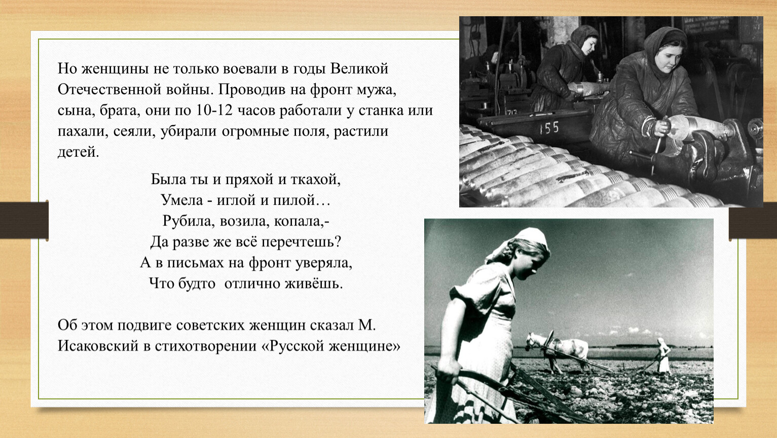 Но женщины не только воевали в годы Великой Отечественной войны. Проводив на фронт мужа, сына, брата, они по 10-12 часов работали у станка или пахали, сеяли, убирали огромные поля, растили детей.