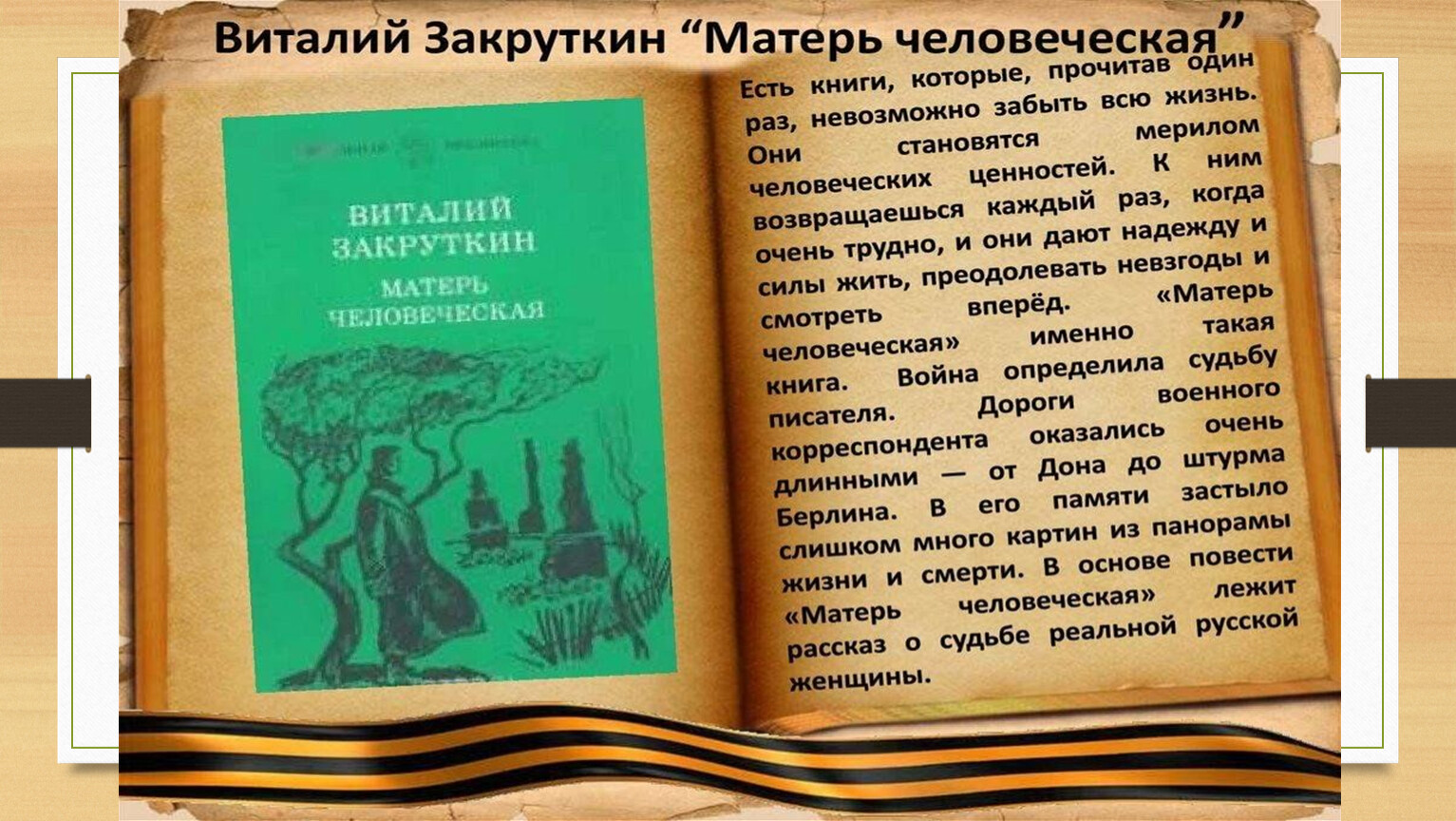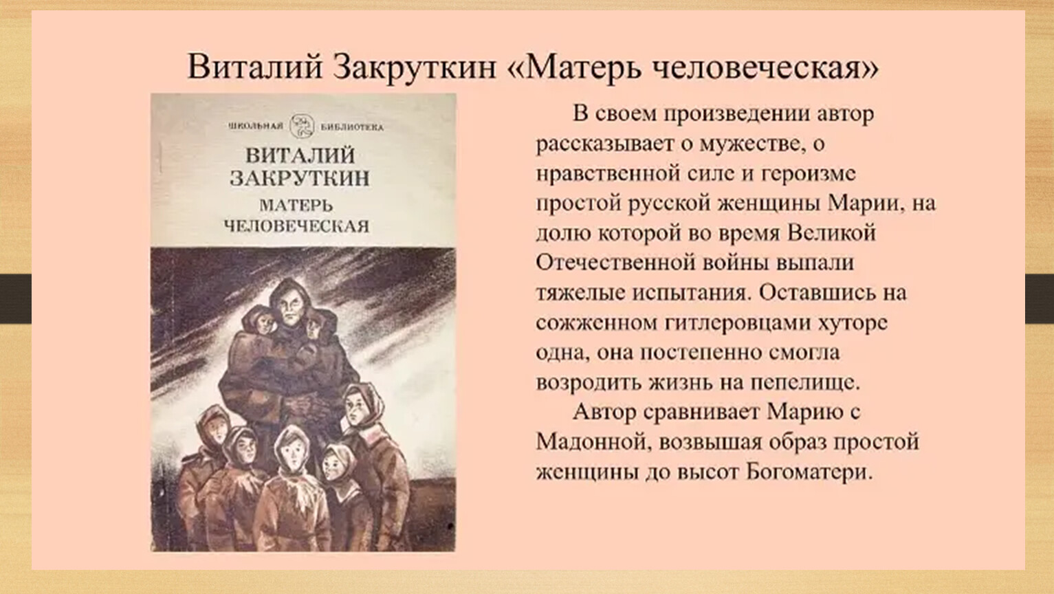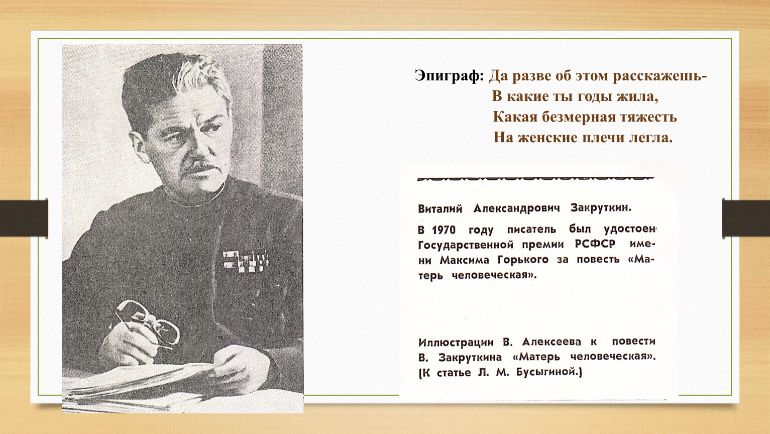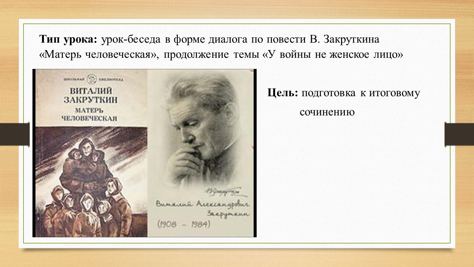 Тип урока: урок-беседа в форме диалога по повести В. Закруткина «Матерь человеческая», продолжение темы «У войны не женское лицо»