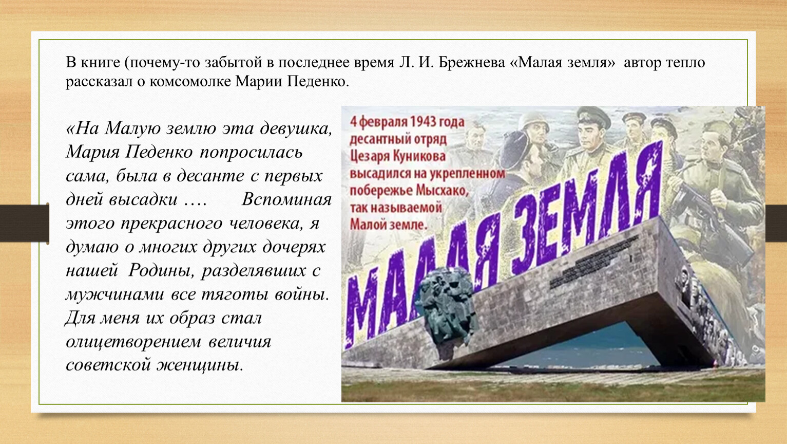 В книге (почему-то забытой в последнее время Л. И. Брежнева «Малая земля» автор тепло рассказал о комсомолке Марии Педенко.