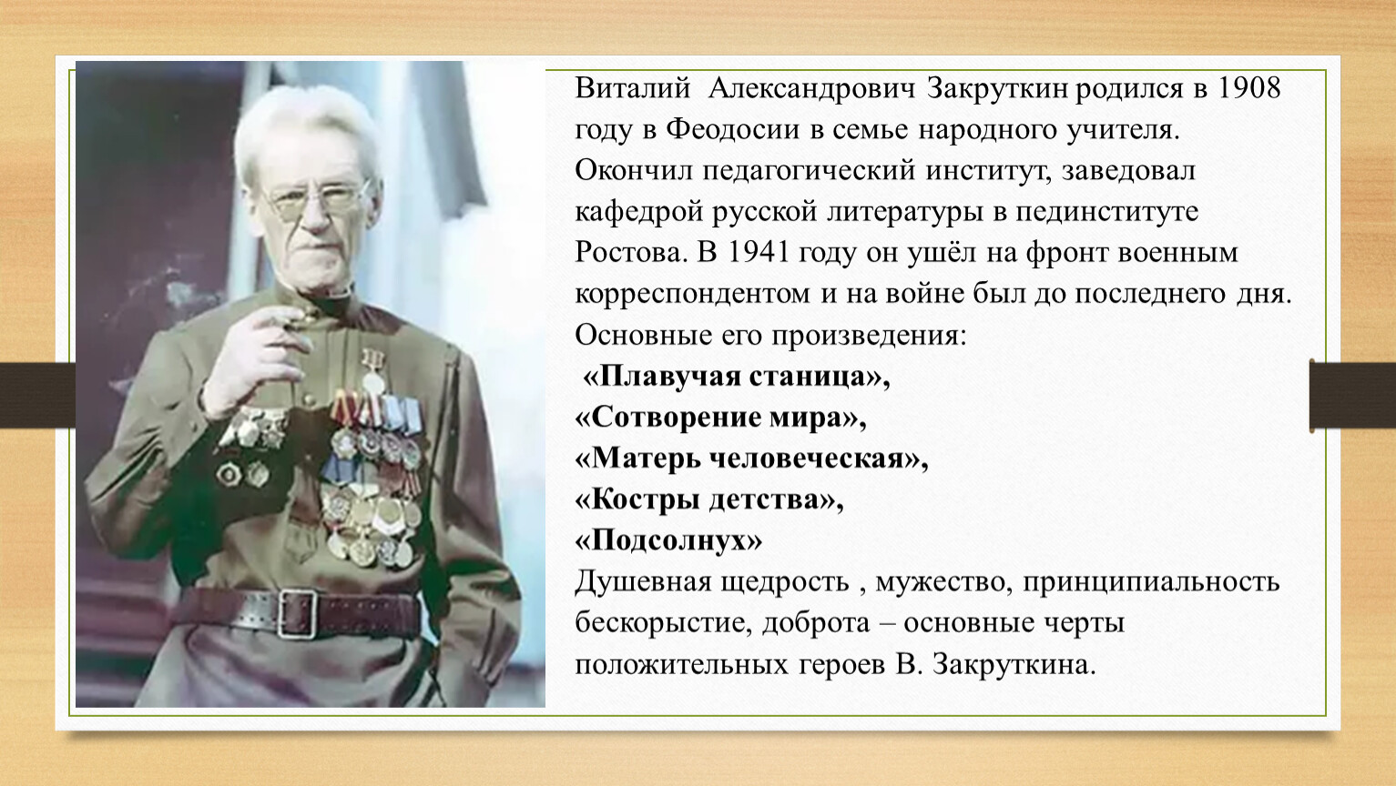 Виталий Александрович Закруткин родился в 1908 году в Феодосии в семье народного учителя. Окончил педагогический институт, заведовал кафедрой русской литературы в пединституте Ростова. В 1941 году он ушёл на фронт военным корреспондентом и на войне был до последнего дня. Основные его произведения: