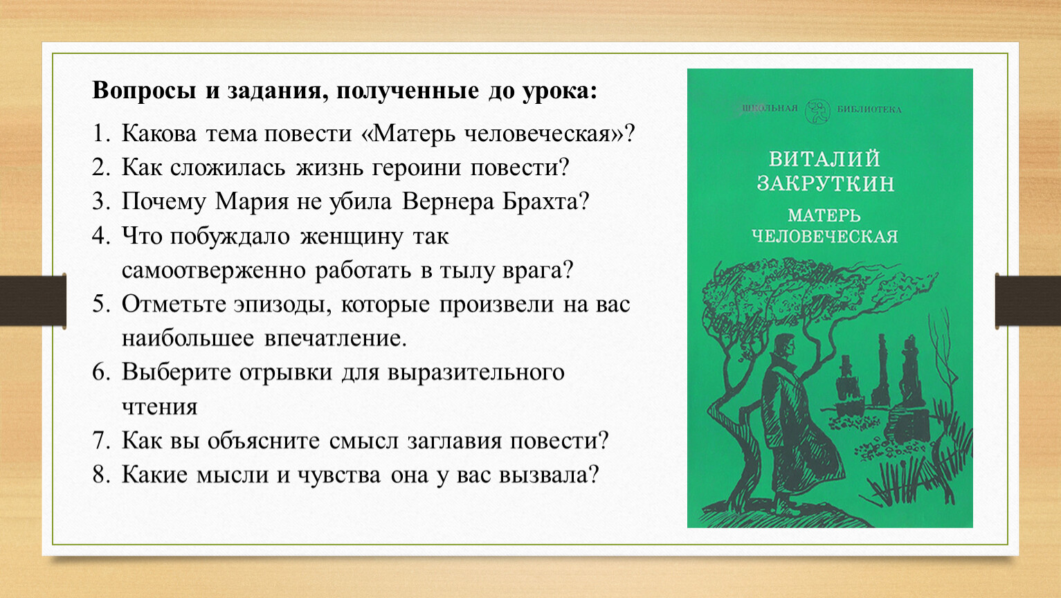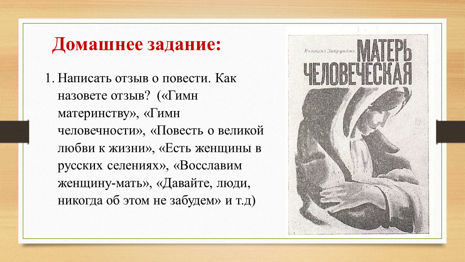 Написать отзыв о повести. Как назовете отзыв? («Гимн материнству», «Гимн человечности», «Повесть о великой любви к жизни», «Есть женщины в русских селениях», «Восславим женщину-мать», «Давайте, люди, никогда об этом не забудем» и т.д)