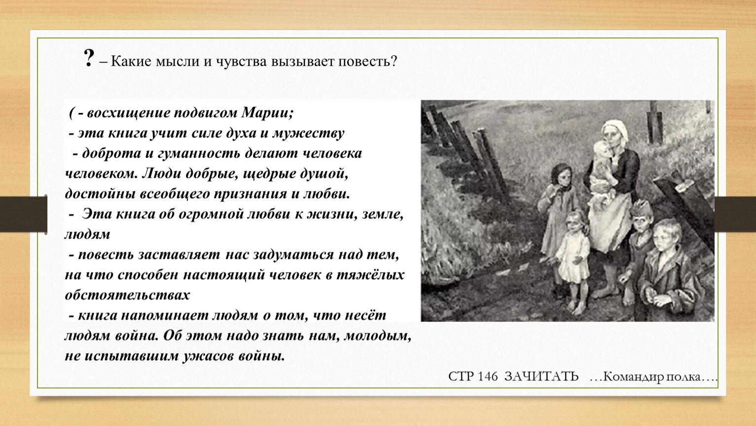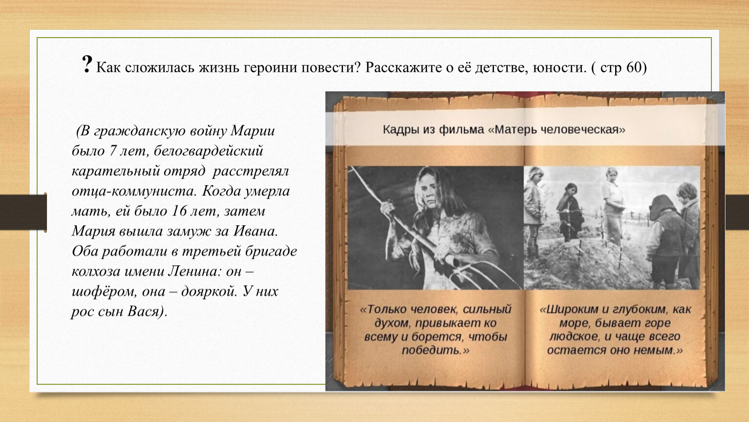 (эта повесть о тяжёлых испытаниях, которые приносит человеку война, о мужестве и нравственной силе простой советской женщины Марии