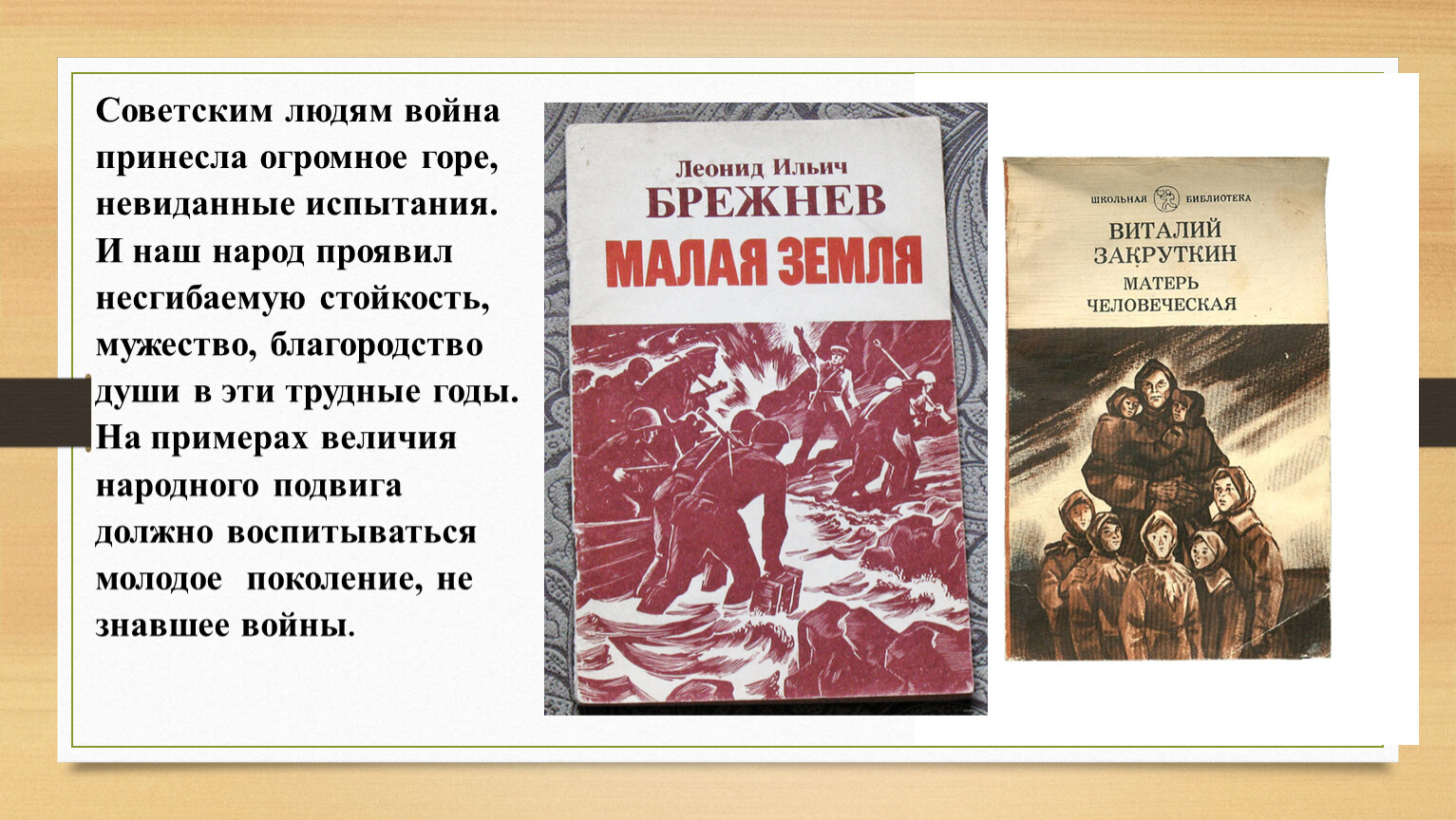 Советским людям война принесла огромное горе, невиданные испытания. И наш народ проявил несгибаемую стойкость, мужество, благородство души в эти трудные годы. На примерах величия народного подвига должно воспитываться молодое поколение, не знавшее войны.