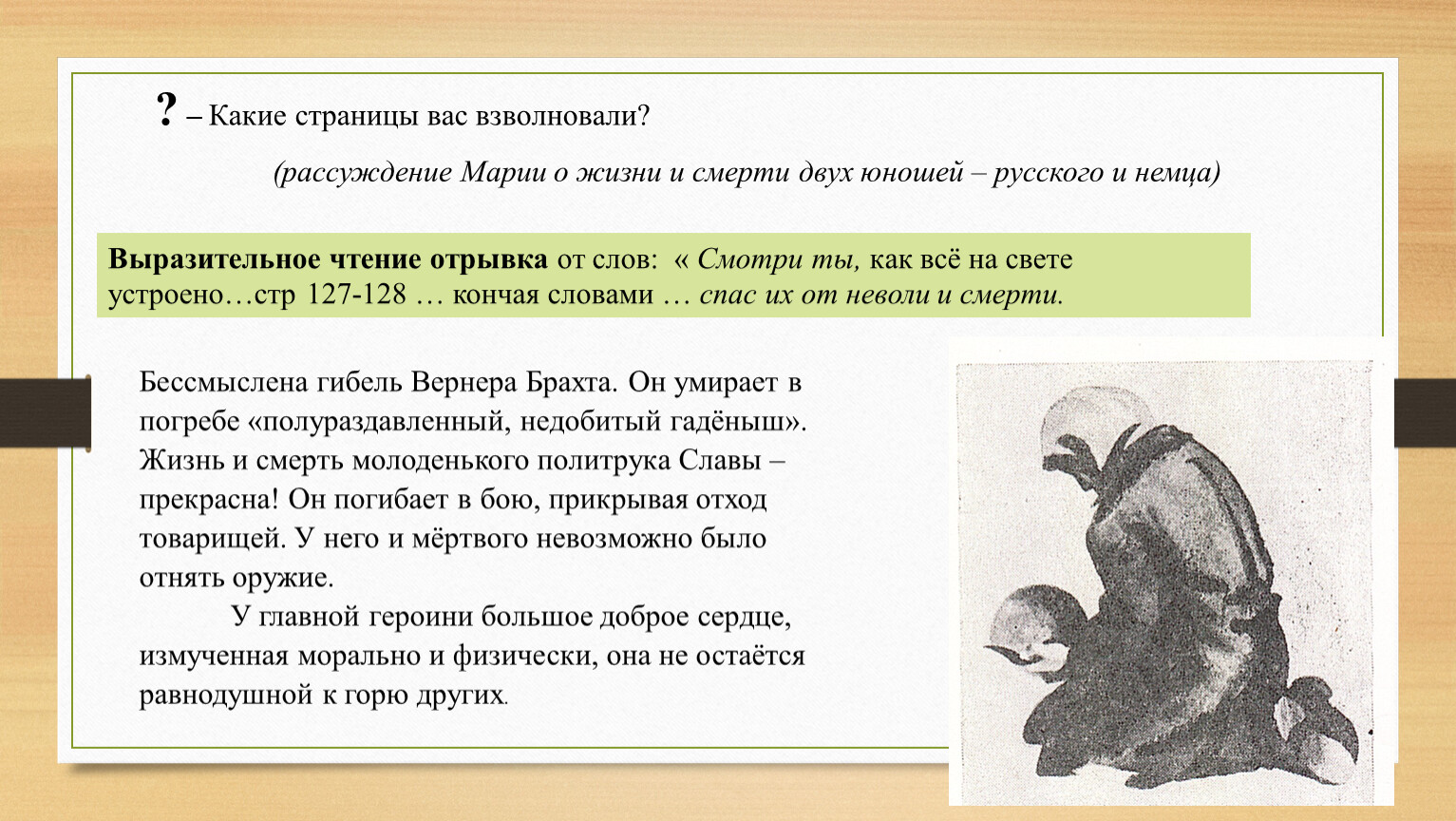 (рассуждение Марии о жизни и смерти двух юношей – русского и немца)