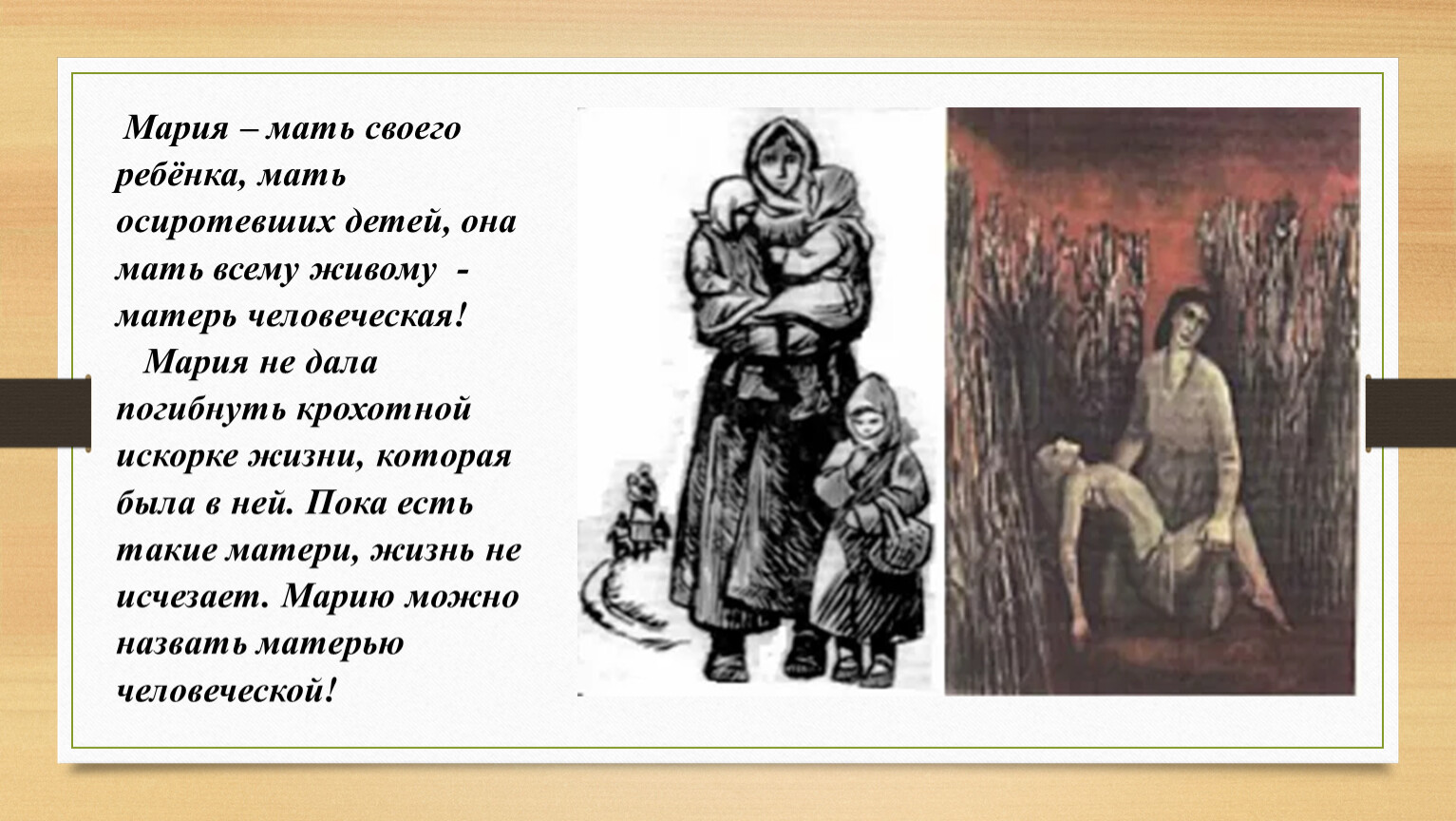 Мария – мать своего ребёнка, мать осиротевших детей, она мать всему живому - матерь человеческая!