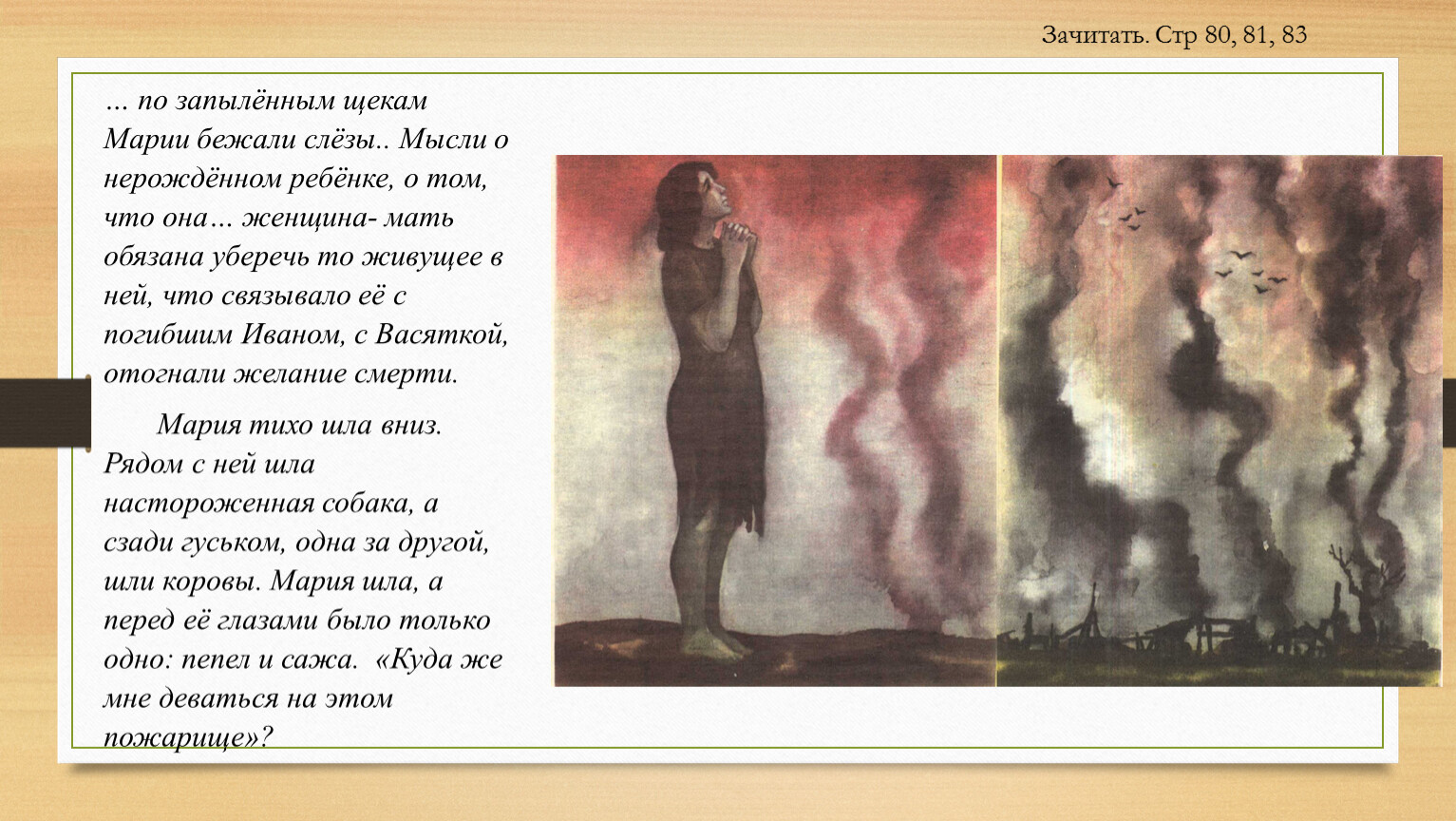 Мария тихо шла вниз. Рядом с ней шла настороженная собака, а сзади гуськом, одна за другой, шли коровы. Мария шла, а перед её глазами было только одно: пепел и сажа. «Куда же мне деваться на этом пожарище»?