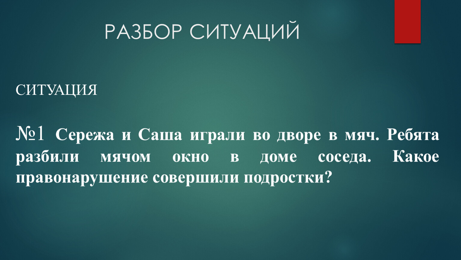 №1 Сережа и Саша играли во дворе в мяч. Ребята разбили мячом окно в доме соседа. Какое правонарушение совершили подростки?