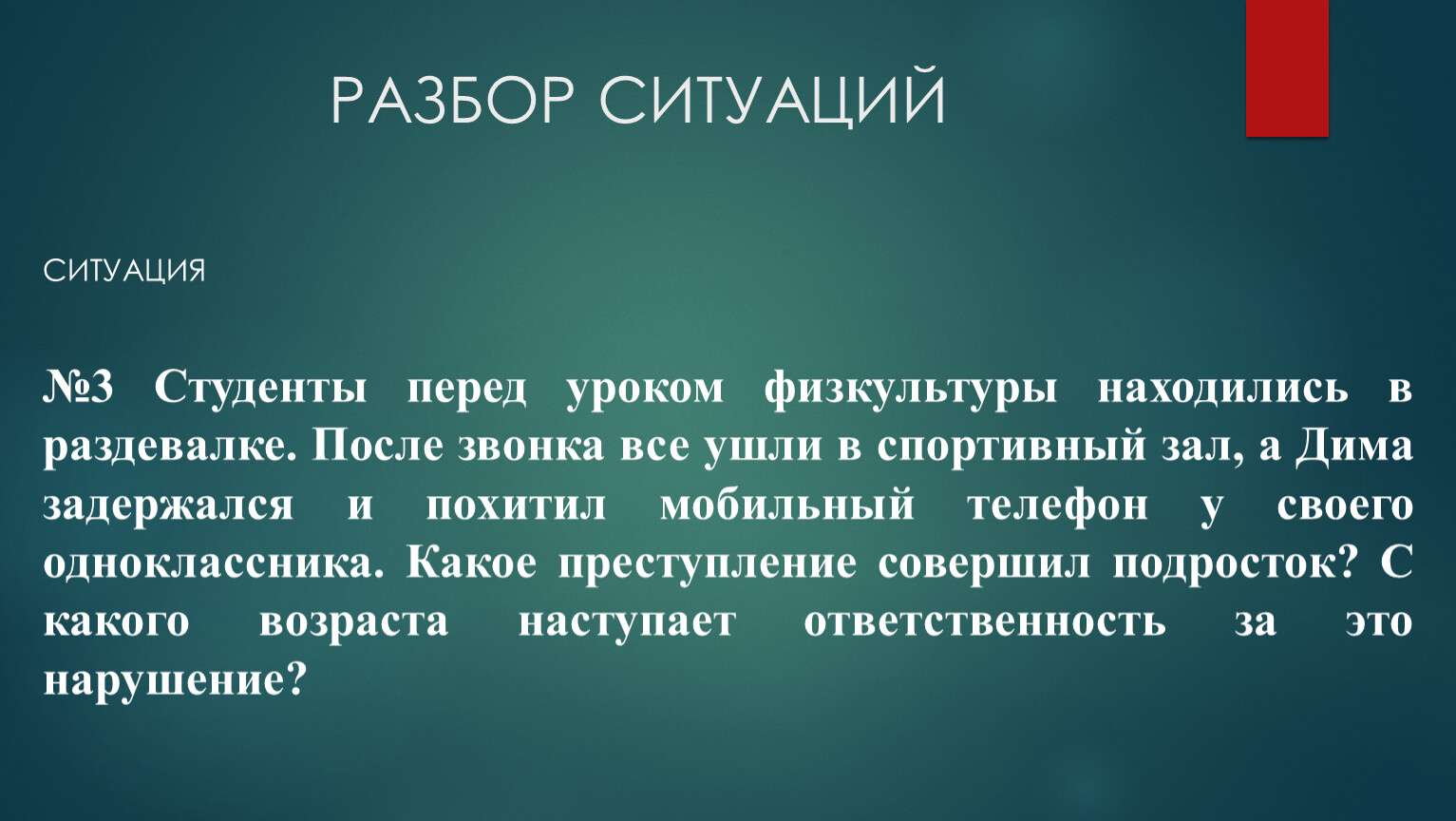 №3 Студенты перед уроком физкультуры находились в раздевалке. После звонка все ушли в спортивный зал, а Дима задержался и похитил мобильный телефон у своего одноклассника. Какое преступление совершил подросток? С какого возраста наступает ответственность за это нарушение?