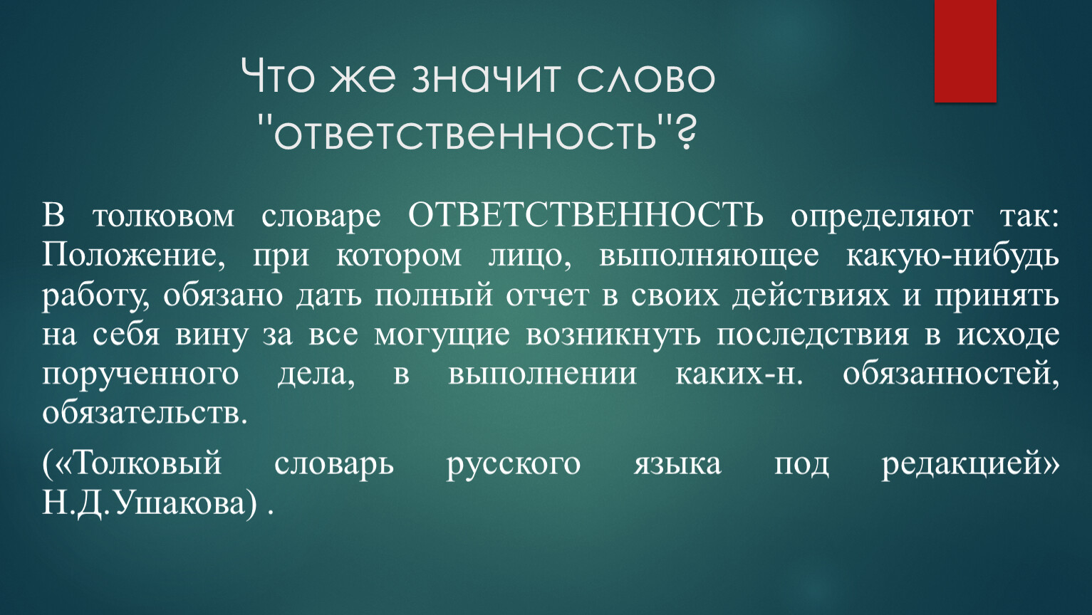 В толковом словаре ОТВЕТСТВЕННОСТЬ определяют так: Положение, при котором лицо, выполняющее какую-нибудь работу, обязано дать полный отчет в своих действиях и принять на себя вину за все могущие возникнуть последствия в исходе порученного дела, в выполнении каких-н. обязанностей, обязательств.