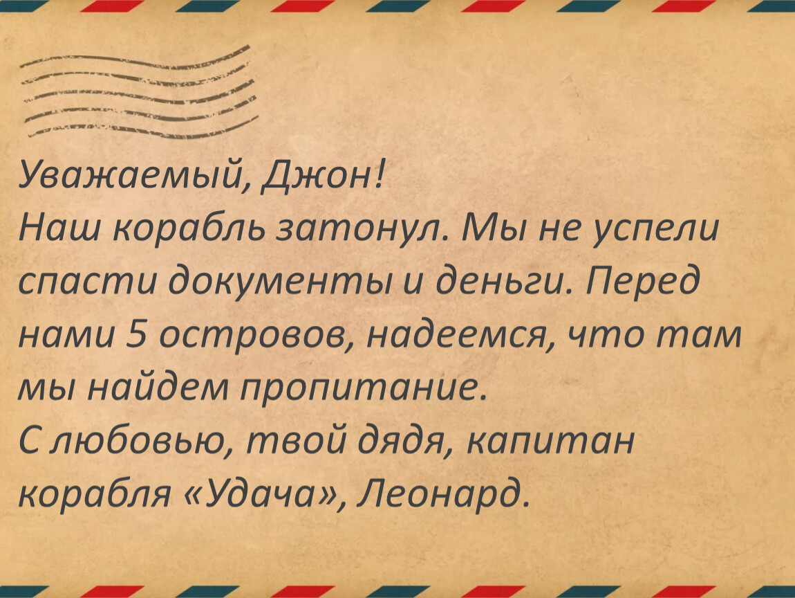 Наш корабль затонул. Мы не успели спасти документы и деньги. Перед нами 5 островов, надеемся, что там мы найдем пропитание.