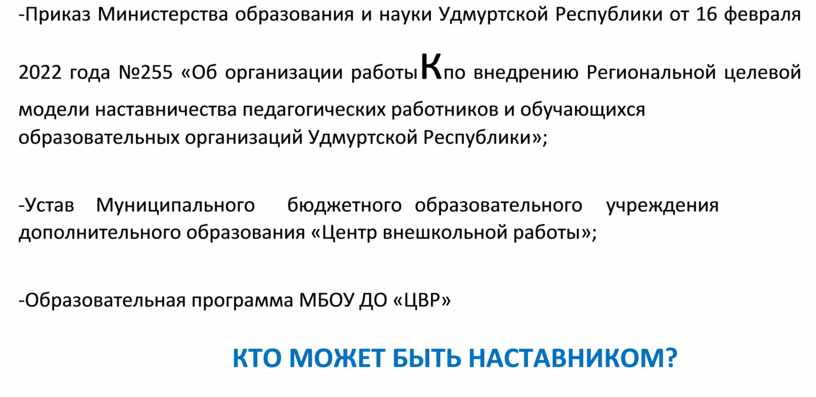 -Приказ Министерства образования и науки Удмуртской Республики от 16 февраля 2022 года №255 «Об организации работыкпо внедрению Региональной целевой модели наставничества педагогических работников и обучающихся