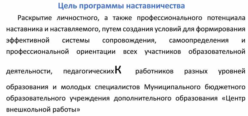 Раскрытие личностного, а также профессионального потенциала наставника и наставляемого, путем создания условий для формирования эффективной системы сопровождения, самоопределения и профессиональной ориентации всех участников образовательной деятельности, педагогическихк работников разных уровней образования и молодых специалистов Муниципального бюджетного образовательного учреждения дополнительного образования «Центр внешкольной работы»