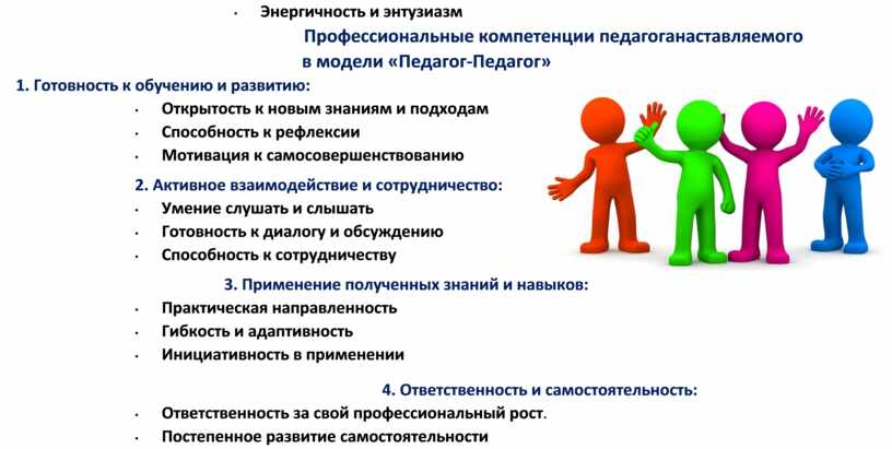 • педагог, готовый к самосовершенствованию, инновационному профессиональному развитию в плане приобретения новых компетенций и опыта, социально мобильный, способный к самообучению и дальнейшей успешной самореализации, но при этом заинтересованный в успехах наставляемого коллеги и готовый нести личную ответственность за его результаты работы.