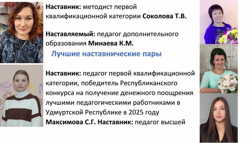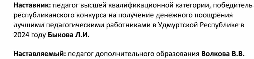 наставнические парыНаставник: педагог высшей квалификационной категории, победитель республиканского конкурса на получение денежного поощрения лучшими педагогическими работниками в Удмуртской Республике в 2024 году Быкова Л.И.