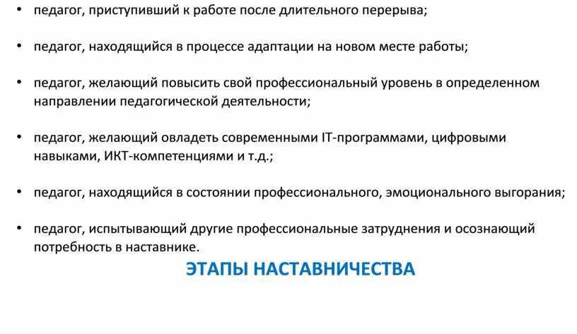 • педагог, испытывающий другие профессиональные затруднения и осознающий потребность в наставнике.