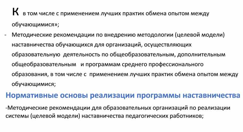 - Методические рекомендации по внедрению методологии (целевой модели) наставничества обучающихся для организаций, осуществляющих образовательную деятельность по общеобразовательным, дополнительным общеобразовательным и программам среднего профессионального образования, в том числе с применением лучших практик обмена опытом между обучающимися;