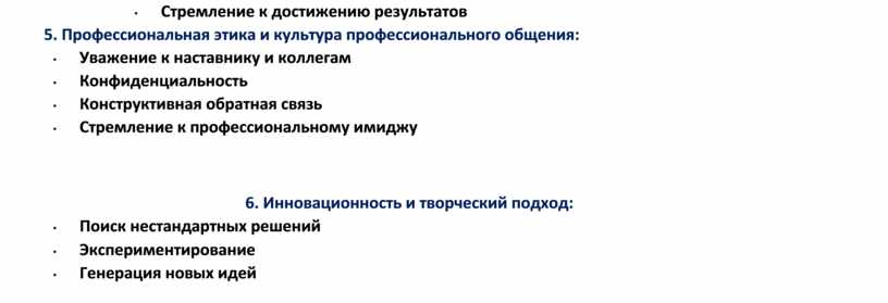 • Уважение к наставнику и коллегам