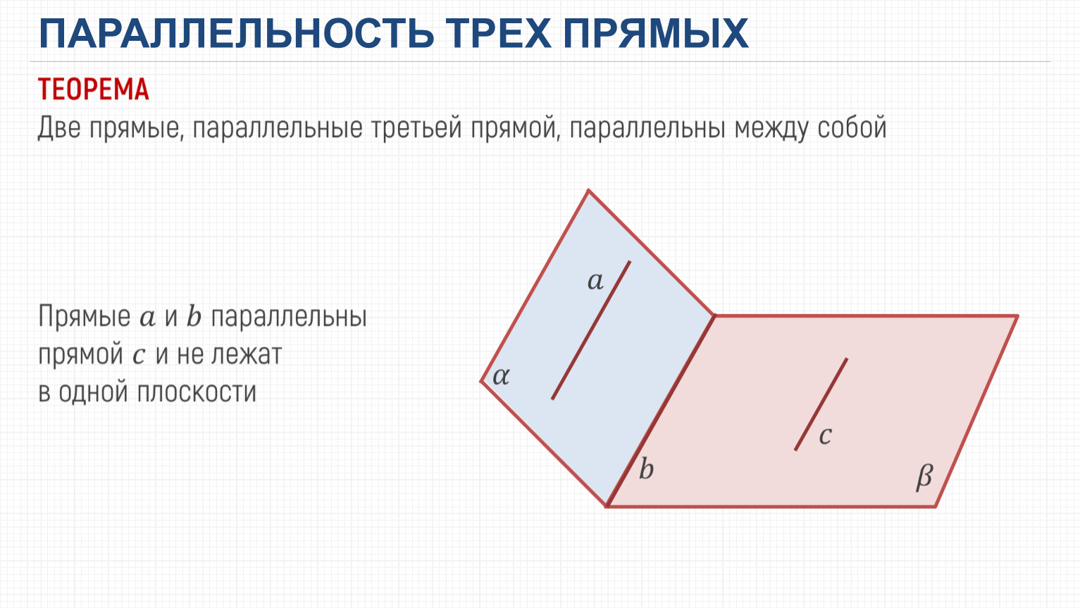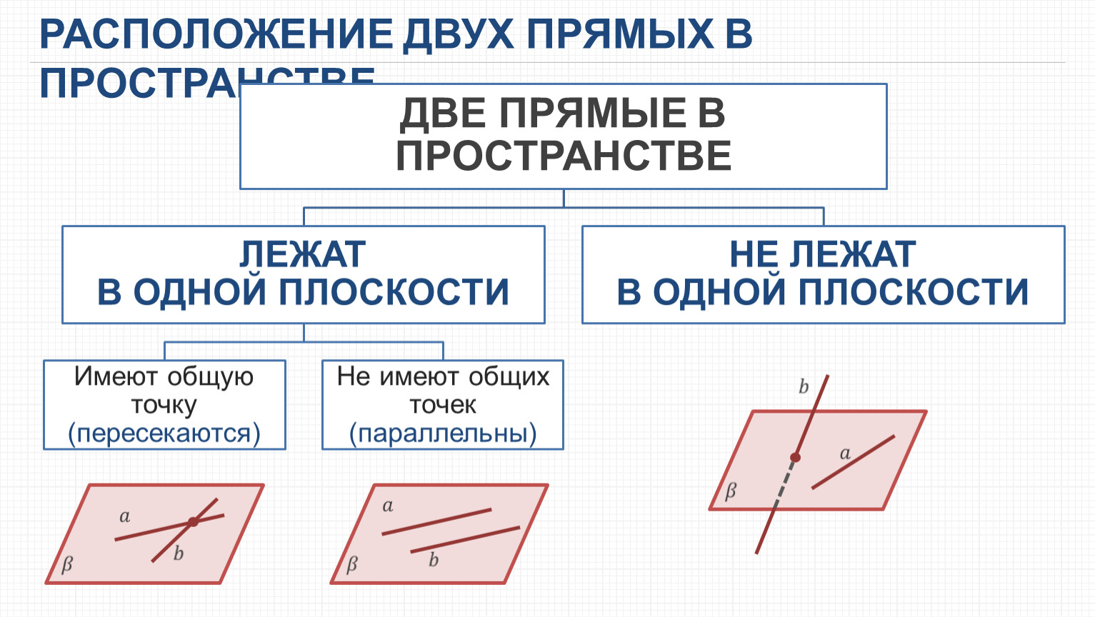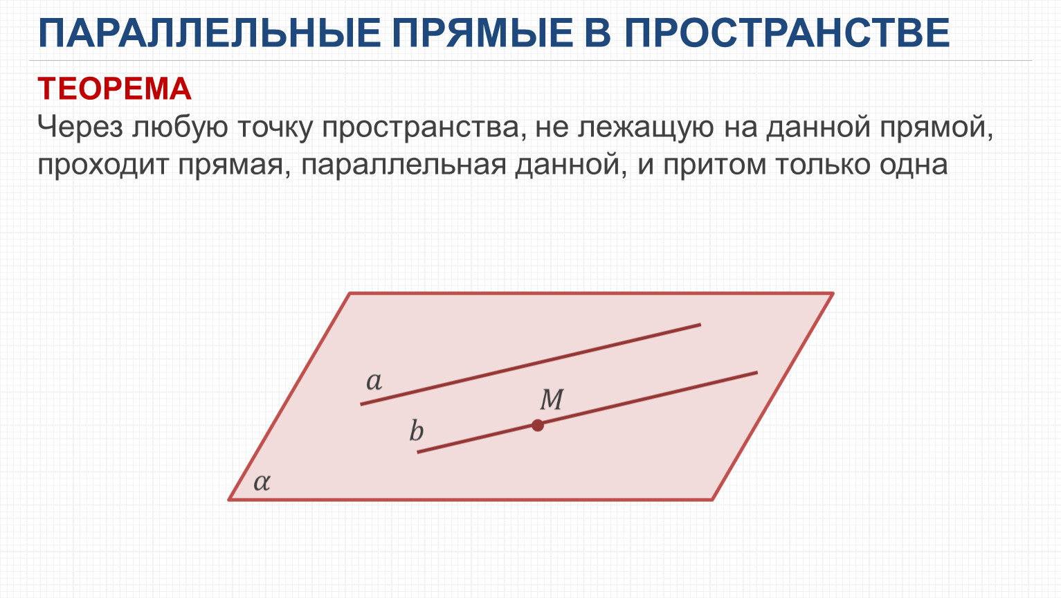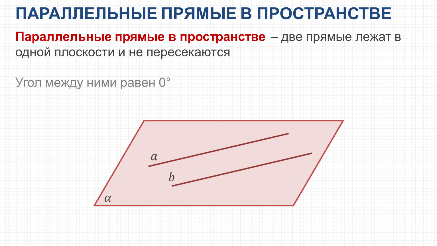 Параллельные прямые в пространстве – две прямые лежат в одной плоскости и не пересекаются
