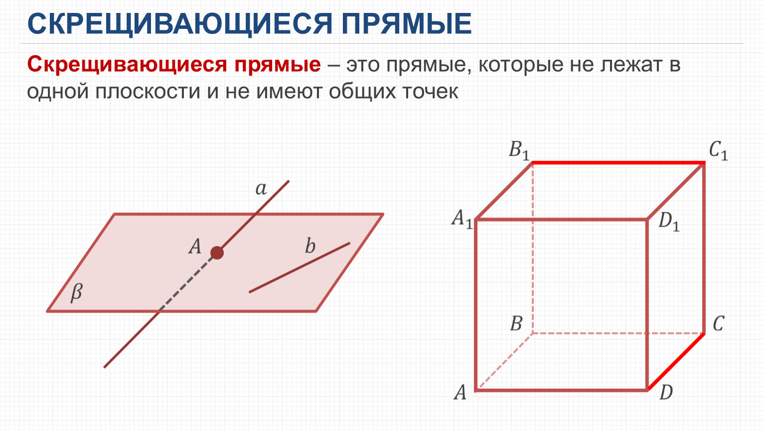 Скрещивающиеся прямые – это прямые, которые не лежат в одной плоскости и не имеют общих точек