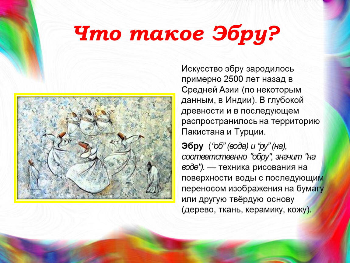 Искусство эбру зародилось примерно 2500 лет назад в Средней Азии (по некоторым данным, в Индии). В глубокой древности и в последующем распространилось на территорию Пакистана и Турции.