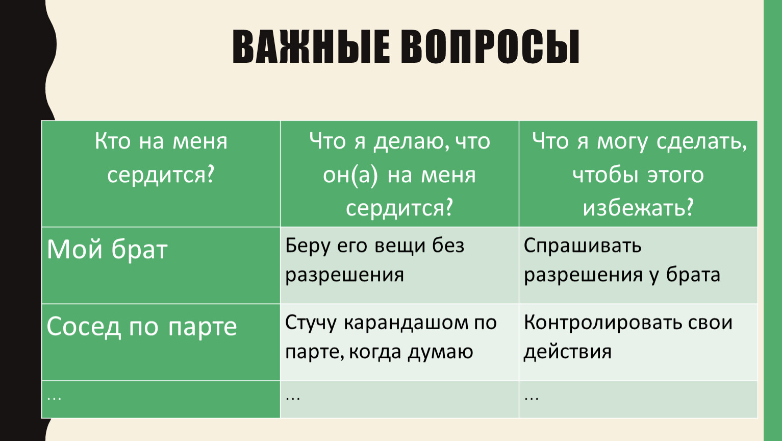 Кто на меня сердится? | Что я делаю, что он(а) на меня сердится? | Что я могу сделать, чтобы этого избежать? |