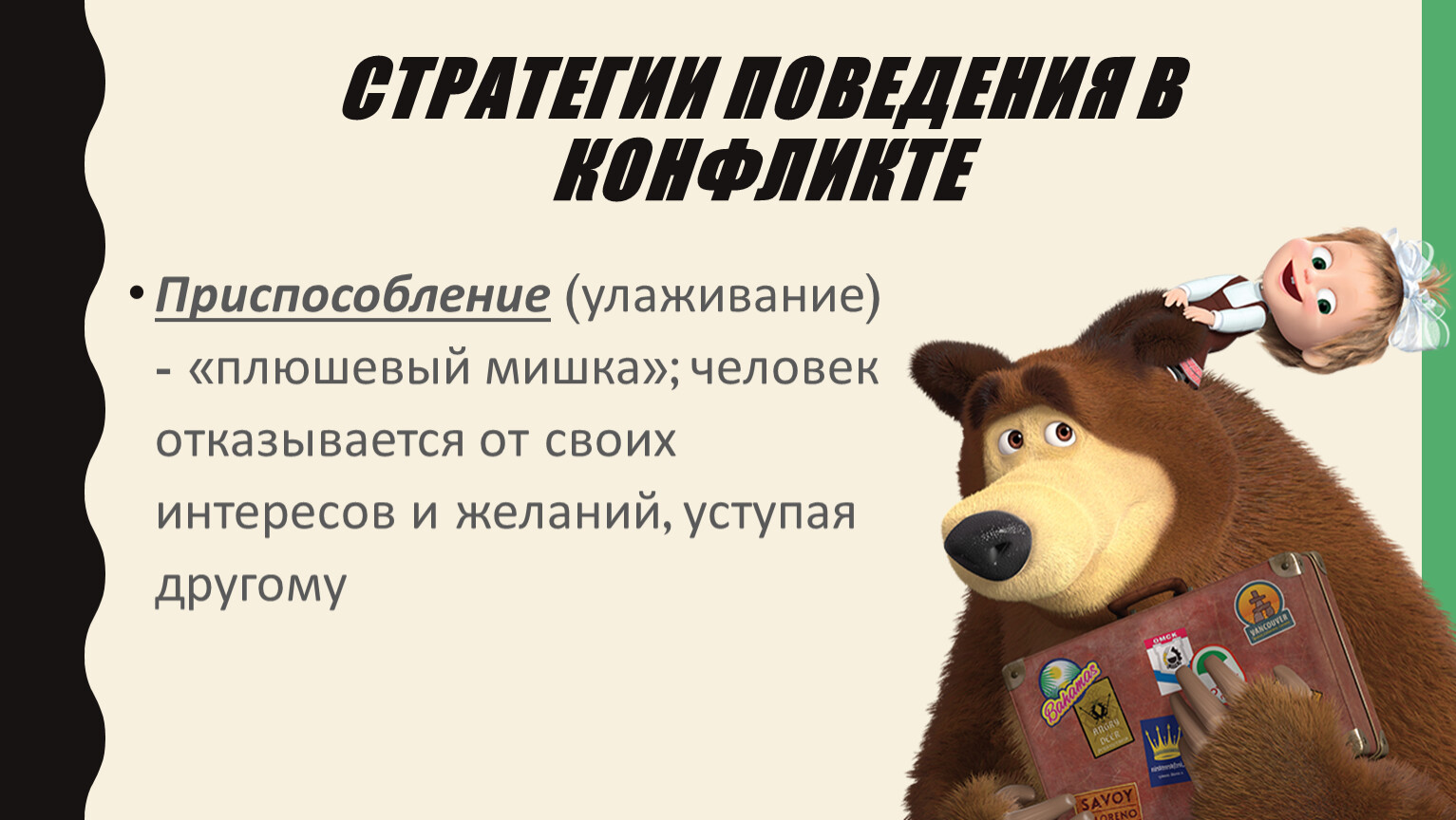 Приспособление (улаживание) - «плюшевый мишка»; человек отказывается от своих интересов и желаний, уступая другому