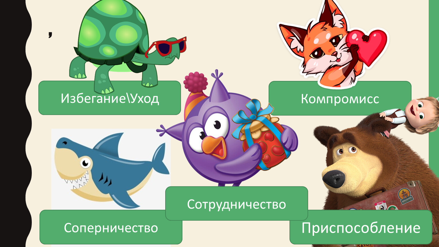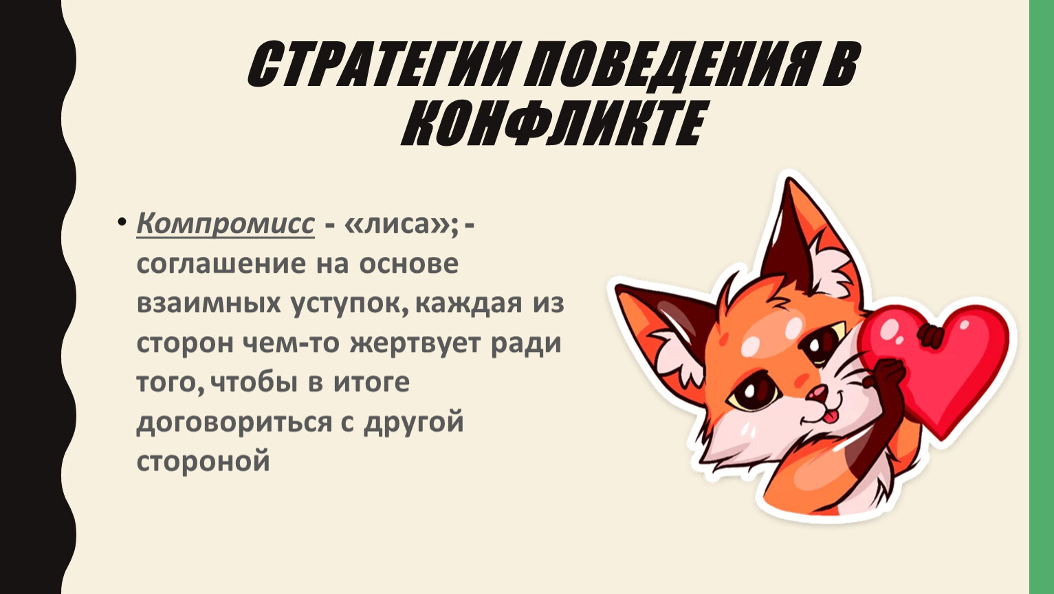 Компромисс - «лиса»; - соглашение на основе взаимных уступок, каждая из сторон чем-то жертвует ради того, чтобы в итоге договориться с другой стороной