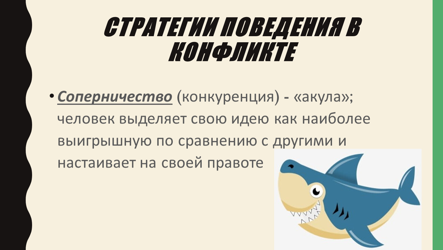 Соперничество (конкуренция) - «акула»; человек выделяет свою идею как наиболее выигрышную по сравнению с другими и настаивает на своей правоте