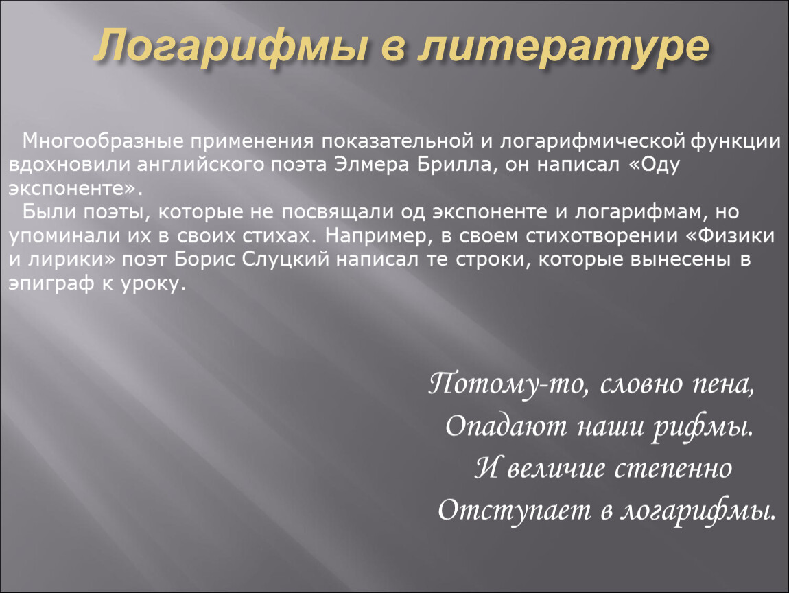Были поэты, которые не посвящали од экспоненте и логарифмам, но упоминали их в своих стихах. Например, в своем стихотворении «Физики и лирики» поэт Борис Слуцкий написал те строки, которые вынесены в эпиграф к уроку.