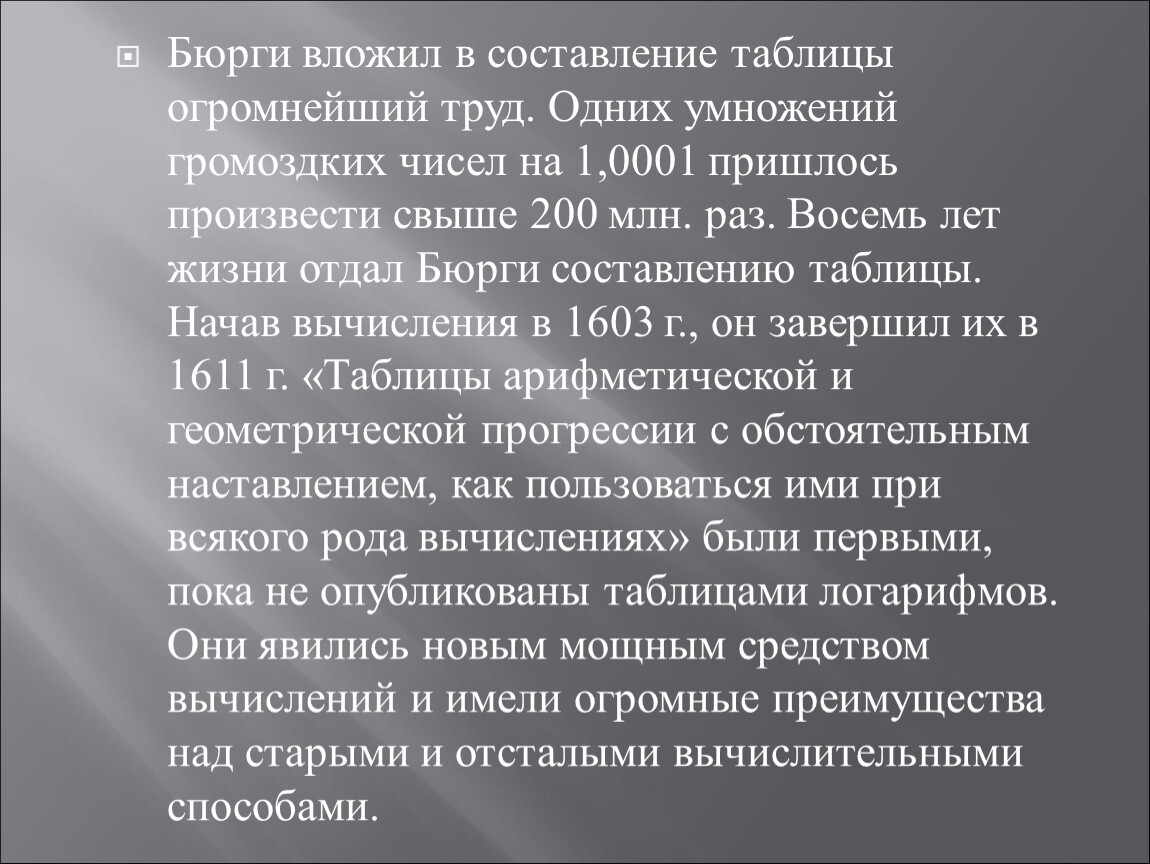 Бюрги вложил в составление таблицы огромнейший труд. Одних умножений громоздких чисел на 1,0001 пришлось произвести свыше 200 млн. раз. Восемь лет жизни отдал Бюрги составлению таблицы. Начав вычисления в 1603 г., он завершил их в 1611 г. «Таблицы арифметической и геометрической прогрессии с обстоятельным наставлением, как пользоваться ими при всякого рода вычислениях» были первыми, пока не опубликованы таблицами логарифмов. Они явились новым мощным средством вычислений и имели огромные преимущества над старыми и отсталыми вычислительными способами.