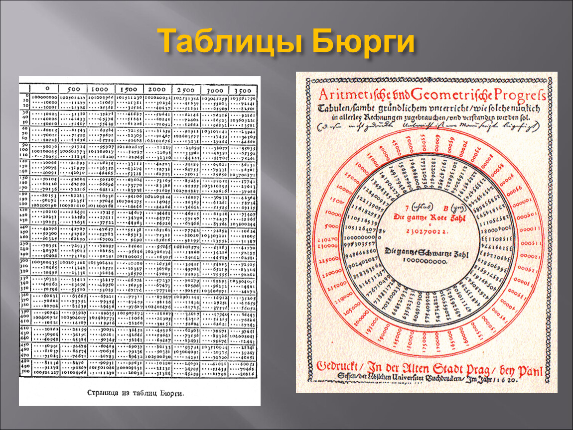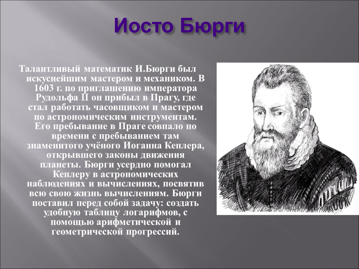 Талантливый математик И.Бюрги был искуснейшим мастером и механиком. В 1603 г. по приглашению императора Рудольфа II он прибыл в Прагу, где стал работать часовщиком и мастером по астрономическим инструментам. Его пребывание в Праге совпало по времени с пребыванием там знаменитого учёного Иоганна Кеплера, открывшего законы движения планеты. Бюрги усердно помогал Кеплеру в астрономических наблюдениях и вычислениях, посвятив всю свою жизнь вычислениям. Бюрги поставил перед собой задачу: создать удобную таблицу логарифмов, с помощью арифметической и геометрической прогрессий.
