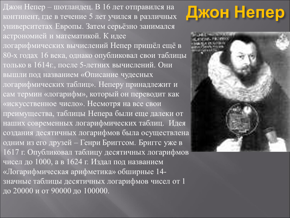 Джон Непер – шотландец. В 16 лет отправился на континент, где в течение 5 лет учился в различных университетах Европы. Затем серьёзно занимался астрономией и математикой. К идее логарифмических вычислений Непер пришёл ещё в 80-х годах 16 века, однако опубликовал свои таблицы только в 1614г., после 5-летних вычислений. Они вышли под названием «Описание чудесных логарифмических таблиц». Неперу принадлежит и сам термин «логарифм», который он переводит как «искусственное число». Несмотря на все свои преимущества, таблицы Непера были еще далеки от наших современных логарифмических таблиц. Идея создания десятичных логарифмов была осуществлена одним из его друзей – Генри Бриггсом. Бриггс уже в 1617 г. Опубликовал таблицу десятичных логарифмов чисел до 1000, а в 1624 г. Издал под названием «Логарифмическая арифметика» обширные 14-значные таблицы десятичных логарифмов чисел от 1 до 20000 и от 90000 до 100000.