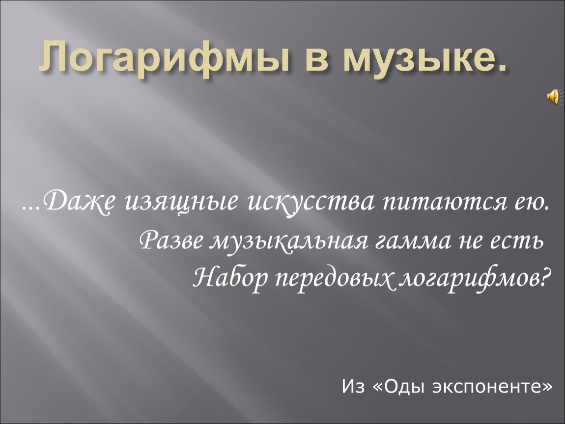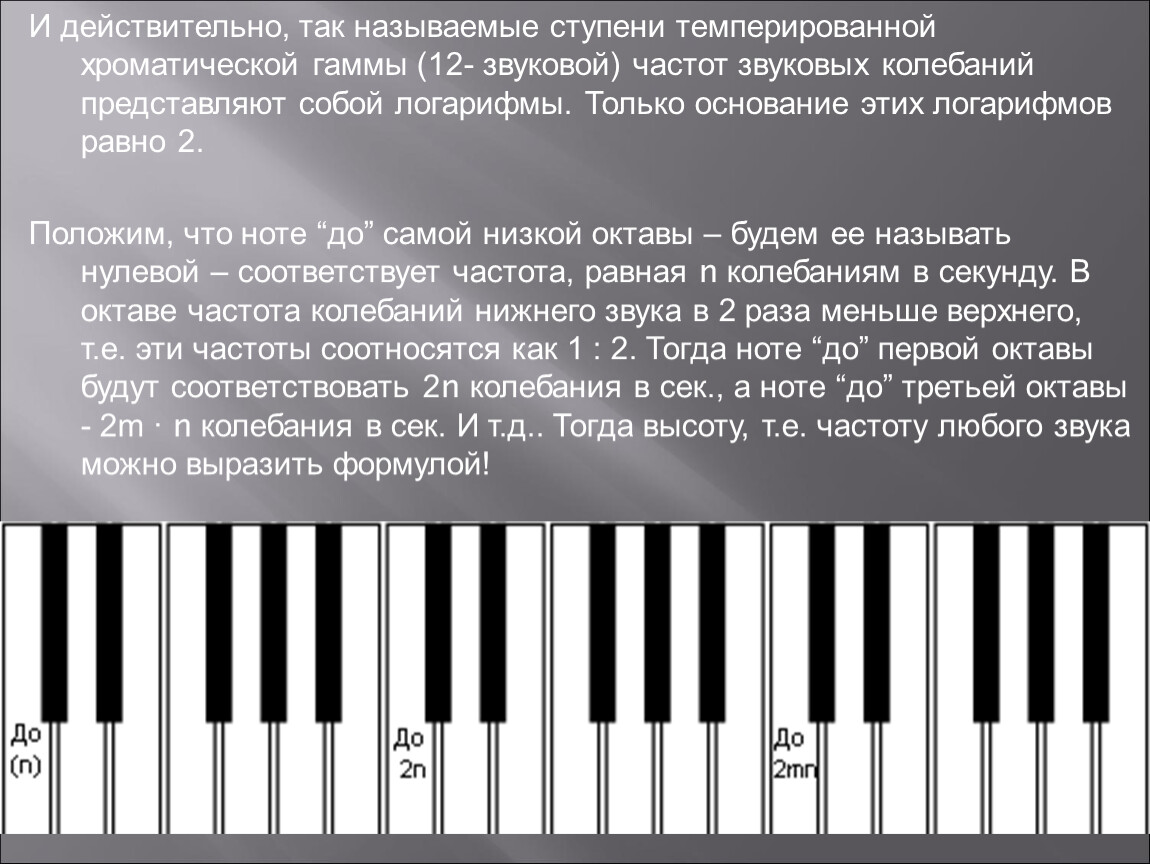 И действительно, так называемые ступени темперированной хроматической гаммы (12- звуковой) частот звуковых колебаний представляют собой логарифмы. Только основание этих логарифмов равно 2.